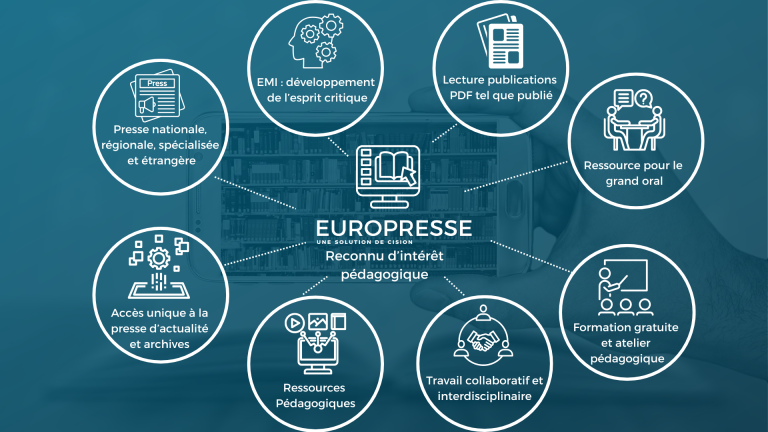Ce médaillon vous permet de retrouver les principaux avantages à l’utilisation d’Europresse au sein de votre établissement, que se soit pour vos élèves ou pour le cadre enseignant.